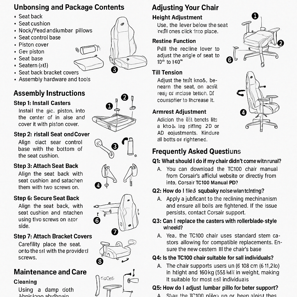Corsair’s official website or direct download will provide you with the TC100 chair manual. - How can I remedy a squeaky sound while I recline?